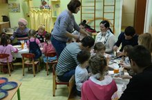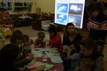 Сегодня вечером работала художественная мастерская для детей и родителей младшей группы №2. Лариса Геннадьевна подготовила много изобразительных средств для нетрадиционных вариантов творческой деятельности. Интересной работой были увлечены дети, мамы, папы и бабушки.