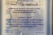Наш детский сад заняла III место в районном этапе городского конкурса среди ДОО и их воспитанников Кировского и Московского районов г.Казани по профилактике ДДТТ "Зеленый огонек 2022"