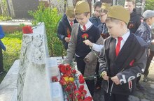 Ученики начальных классов возложили цветы к Памятному камню на улице Алтынова. Эта улица названа в честь Героя Советского Союза, танкиста Николая Николаевича Алтынова. Н.Н. Алтынов прошел с боями тысячи километров, уничтожив большое количество живой силы и техники противника.
