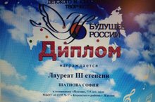 Поздравляем ученицу 2 В класса Шатнову Софию, Лауреата IIIстепени Всероссийского фестиваля детского и юношеского творчества "Будущее России" в номинации "Поэзия". Руководитель: Салахова З.С.