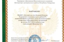 Һәр уку елы тәмамланганнан соң балалар бакчаларының укыту-тәрбия эшенә йомгак ясала. Менә 2017-2018 нче уку елының нәтиҗәләре буенча азкомплектлы балалар бакчалары арасында безнең балалар бакчасы беренче урынны яулады. Әфэрин! Без булдырабыз!!!