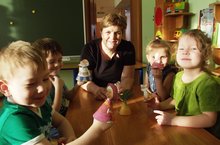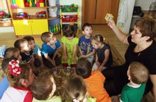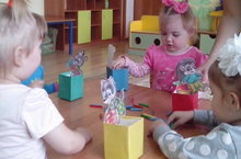 Дидактик уеннар - балаларны уйланырга, эзләнергә, фикер тупларга, берләштерергә, күнекмәләрне, гадәтләрне тормышта кулланырга өйрәтүче һәм тәрбия бирүче көчле чараларның берсе. Шуны истә тотып тәрбиячеләребез тырышып дидактик уеннарны үзләре дә ясап балалар белән эшләргә тырышалар. Мәсәлән, фотода Рәфидә Рәфәгатовна беренче кечкенәләр төркеме балалары белән бик үзенчәлекле уен аша баланың күзаллавын һәм маториканы үстерерү өстендә эшли.Уен вакытында бала предметларны чагыштырырга, охшаш һәм аерым якларын ачыкларга өйрәнә; предметларның үзенчәлекләре: төсе, зурлыгы, формасы, сыйфаты белән таныша. Соңыннан уенның эчтәлеге катлауландырыла.