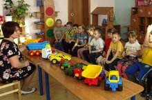 Воспитатель старшей группы Зубейда Рафисовна на занятии русского языка знакомит детей с разными видами автомобилей и транспортом.