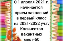 C 1 апреля 2021 г. начинается прием заявлений в первый класс на 2021-2022 учебный год. Количество вакантных мест - 60.