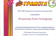 Учащаяся нашей школы Аглиуллина Алия награждена Грамотой за участие в муниципальном этапе II международного литературного конкурса чтецов "Джалиловские чтения" в номинации "Джалиль на русском".