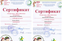За участие в районном конкурсе "Татар малае - 2022" ученик 4 класса Хасанов Данис (руководитель Рахимова Р. К.), за участие в конкурсе "Татар кызы - 2022" ученица 2 класса Гарипова Ясмина (руководитель Абдуллина г. р.) были награждены сертификатами.