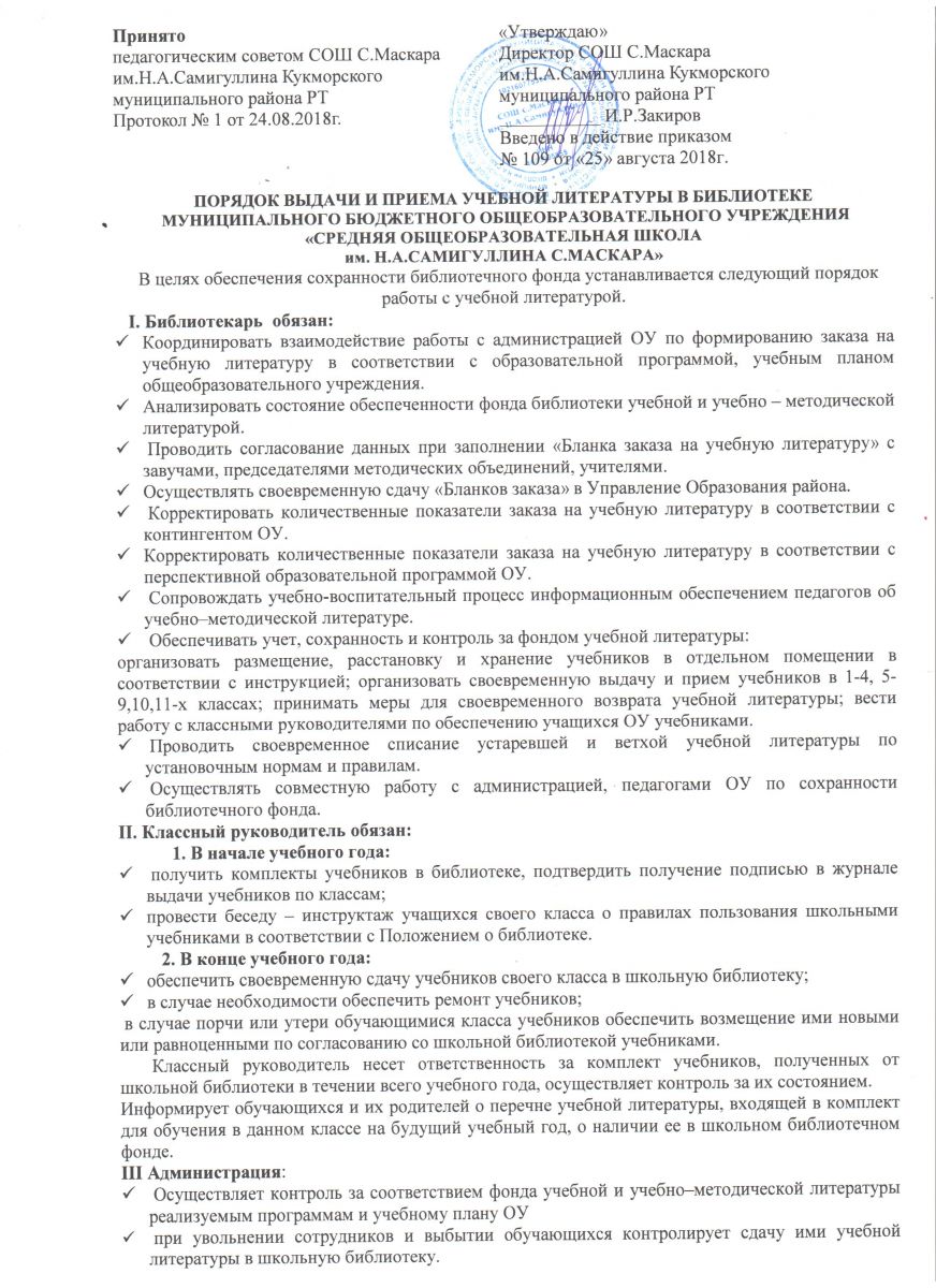 Порядок выдачи и приема учебной литературы в библиотеке