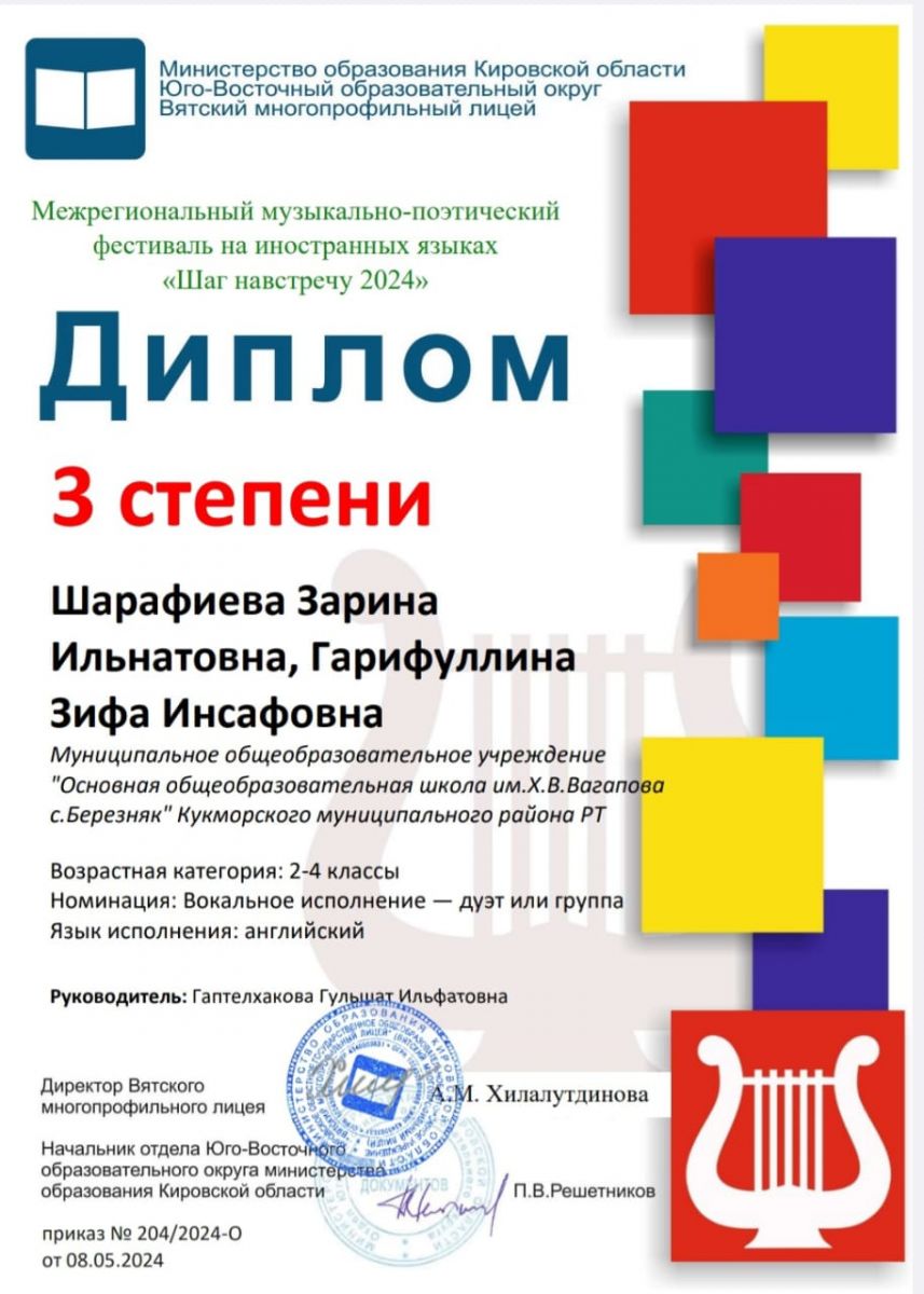 с участием детей школьного возраста, одарённых в области иностранных языков. И в этом году у них призовые места. Поздравляем ученика 5 класса Зиятдинова Саита с дипломом 2 степени и учениц 3 б класса филиала д. Камышлы Шарафиеву Зарину и Гарифуллину Зифу с дипломами 3 степени. Молодцы!!! -