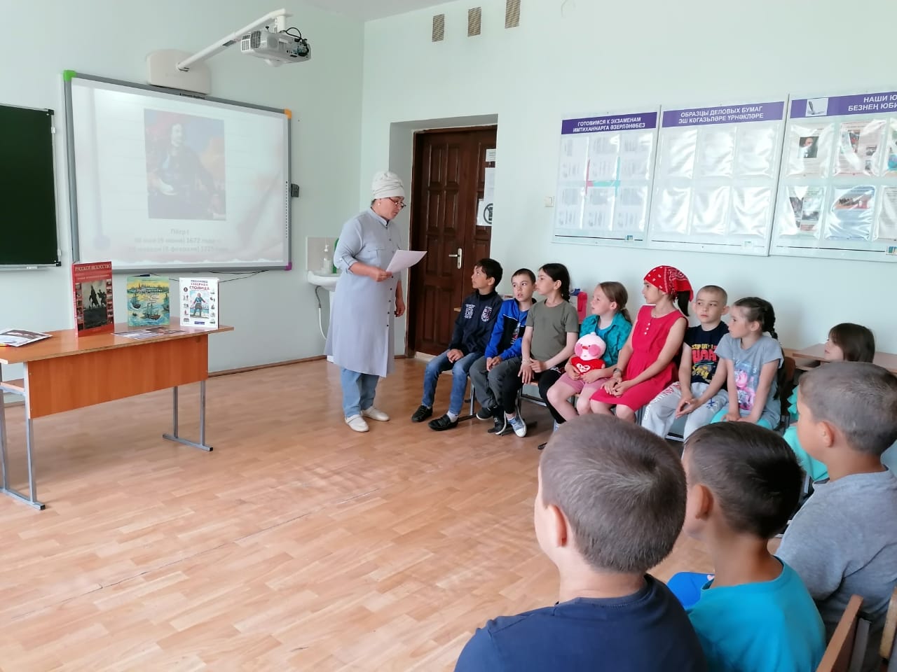 Петр I-нең тууына 350 ел уңаеннан укучылар белән әңгәмә, китаплар күргәзмәсе һәм рәсем конкурсы оештырылды.