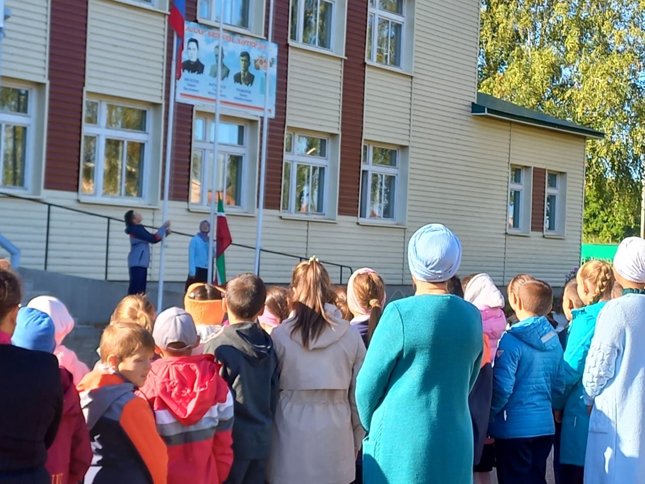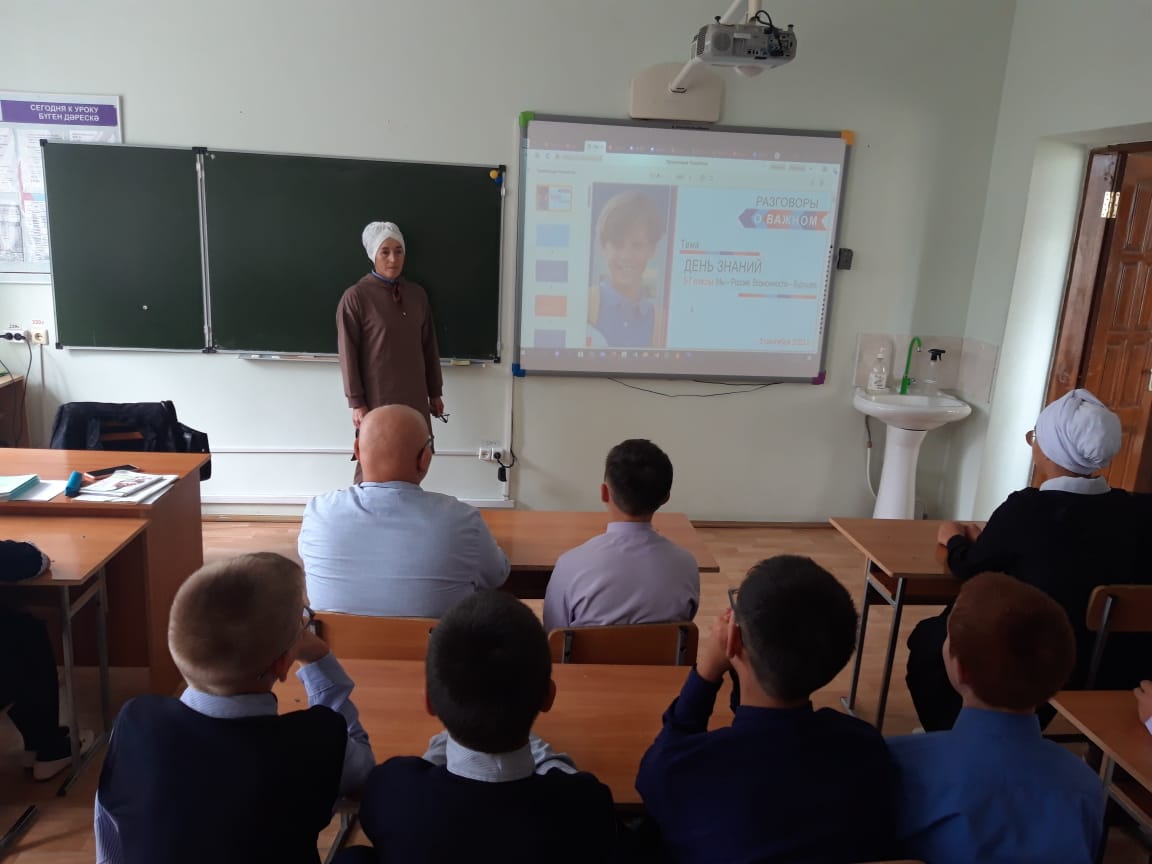 Яна атнаның беренче уку көне Россия Федерациясе флагын кутәрү хәм гимны башкару белән башланып китте. Шулай ук "Мөхим сөйлэшүләр" дип исемләнгән - белем, уку хәм тормыштагы уңышлар темасына яна дәрес тә уткәрелде. -