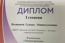 Старший воспитатель нашего детского сада Назипова Г.М. награждена Дипломом 1 степени Республиканского конкурса "Патриоты России" в номинации "Защита проекта". Поздравляем!