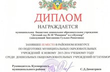 Поздравляем коллектив нашего детского сада, занявший 3-е место в районном конкурсе по подготовке муниципальных образовательных учреждений к новому 2015-2016 учебному году среди дошкольных общеобразовательных учреждений п.г.т.Кукмор.