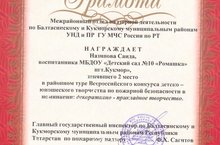 Поздравляем воспитанников старшей группы Назипова Саида и Низамову Амиру, занявших 2 места в районном туре Всероссийского конкурса детско-юношеского творчества по пожарной безопасности в номинации: декоративно-прикладное творчество. Желаем им дальнейших успехов!