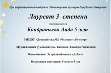 Балалар бакчасында тәрбияләнүче Кондратьева Аида "Иҗат үрнәге"халыкара талантлар конкурсында III дәрәҗә лауреаты булды. Лаеклы җиңүе белән котлыйбыз!