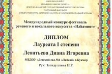 Казан дәүләт мәдәният институтында "Илhамият - Вдохновение" сөйләм һәм вокал сәнгате халыкара фестиваль-конкурсы үткәрелде. Анда безнең балалар бакчасының мәктәпкә әзерлек төркеменнән Леонтьева Диана катнашты. Алар 1 дәрәҗә Лаөреат иссеменә лаек булды. Диананы һәм аның остазы музыка җитәкчесе Загидуллина Индира Радик кызын зур җиңү белән котлыйбыз.
