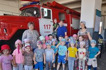 Бүлекчә командиры Петров А.С. янгын часте буенча экскурсия үткәрде һәм балаларны янгын сүндерү машинасының, янгын сүндерү костюмы үзенчәлекләре белән таныштырды. Балалар янгын сүндерүче каскасын үзләренә сынап карадылар, махсус тренажерларда булдылар. -