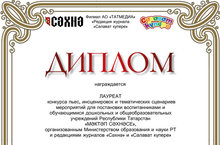 Наши воспитатели: Вахитова Г.Г., Базгутдинова Г.Р, Ямалова З.И., Рахимуллина Г.Х., и инструктор по физической культуре Шарипова Г.Ф. стали лауреатами республиканского конкурса пьес и сценариев для постановки воспитанниками дошкольных учреждений "Мэктэп сэхнэсе" организованный Министерством образования и науки РТ и журналами " Сэхнэ" и "Салават купере"