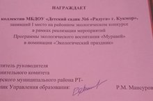 Наш детский сад стал победителем районного экологического конкурса "Муравей". В рамках конкурса нами были проведены различные акции " Очисти территорию от мусора", "Собери макулатуру и спаси лес", "Помоги растениям вырасти" и т.д. Данная работа закрепила знания детей об экологической обстановке на нашей Планете и научила их видеть прекрасное в близком окружение.