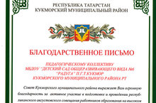 За активное участие в подготовке и проведении республиканского августовского совещания работников образования на высоком организационном уровне наш детский сад был отмечен Благодарственным письмом Главы Кукморского района РТ, Мы в свою очередь выражаем благодарность всему коллективу детского сада за сплоченную и плодотворную работу.
