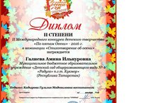 Подведены итоги конкурса «По пятам Осени» который проводился Информационно-издательским центром «ОЛИВЬЕ» и редакцией журнала «Музыкальный оливье». Данный конкурс был направлен на выявление педагогов, умеющих взаимодействовать с детьми и детскими коллективами для получения хорошего творческого результата. На конкурс было представлено 807 работ и среди них воспитанница нашего детского сада Галиева Амина стала лауреатом 2 степени, представив вниманию жюри стихотворение "Перед отлетом". Поздравляем нашу воспитанницу с Победой.