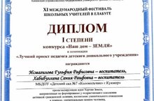С 17 по 19 августа в г.Елабуга прошел XI Международный фестиваль школьных учителей. На торжественном закрытии фестиваля состоялось награждение участников конкурса "Наш дом - Земля". В номинации "Лучший проект педагога детского дошкольного учреждения" воспитатели нашего детского сада Исмагилова Гульфия Рафисовна и Хабибуллина Сания Раифовна были награждены дипломом 1 степени. Поздравляем! Желаем дальнейших побед!