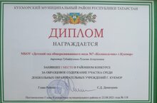 В Доме культуры нашего города сегодня состоялось пленарное заседание августовского совещания работников образования Кукморского муниципального района Республики Татарстан. По результатам муниципального конкурса по подготовке образовательных учреждений к новому учебному году наш детский сад занял 1 место за образцовое содержание участка среди ДОУ г.Кукмор. Выражаем огромную благодарность родителям наших воспитанников в благоустройстве участков и всему нашему дружному коллективу!