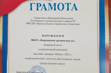 Безнең мәктәп икенче төркем урта гомуми белем бирү оешмаларының мәктәп яны участогын үрнәк карап тоту өчен район конкурсында III урынны яулады.Котлыйбыз!
