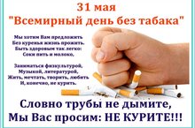 31 мая - Всемирный день борьбы с курением. Школьный отряд СМС-дети подготовили информацию к этой знаменательной дате. Всемирный день без табака (World No Tobacco Day)- это международная акция по борьбе с курением, которая ежегодно проводится во всем мире 31 мая. День был установлен в 1987 году Всемирной организацией здравоохранения (ВОЗ) для привлечения глобального внимания к табачной эпидемии и ее смертельным последствиям./ 31 май-Бөтендөнья тәмәке тартуга каршы көрәш көне. СМС-мәктәп отряды балалар әлеге истәлекле дата турында мәгълүмат әзерләделәр. Бөтендөнья тәмәкесез көн( World No Tobacco Day) - ел саен 31 майда бөтен дөньяда үткәрелә торган тәмәке тартуга каршы Халыкара акция. Көн тәмәке эпидемиясенә һәм аның үлем нәтиҗәләренә Глобаль игътибар җәлеп итү өчен Бөтендөнья сәламәтлек саклау оешмасы (ВОЗ) тарафыннан 1987 елда билгеләнгән.