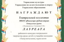 Мәктәпкә әзерлек төркеме балалары белән әзерләнгән Г.Тукайның “Эш беткәч уйнарга ярый” әсәре белән театр еллыгына багышланган конкурста катнашып лауреат исеменә лаек булдылар. Алга таба да сезгә уңышлар телибез!