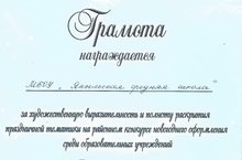 За художественную выразительность и полноту раскрытия праздничной тематики на районном конкурсе новогоднего оформления среди образовательных учреждений наша школа награждена Грамотой Управления образования Кукморского муниципального района Республики Татарстан.