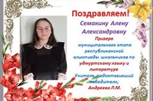 Семакина Алена, ученица 9 класса, стала призером республиканской олимпиады школьников по удмуртскому языку и литературе (учитель Андреева Л.М.). Молодец. Поздравляем! Желаем дальнейших успехов!