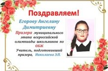 Егорова Ангелина , ученица 4 класса, стала призером муниципального этапа всероссийской олимпиады школьников по ОБЖ (учитель Николаева Э.П.) Поздравляем!