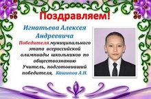Игнатьев Алексей, ученик 7 класса, стал победителем муниципального этапа всероссийской олимпиады школьников по обществознанию (учитель Кашипов А.Н.) Поздравляем!