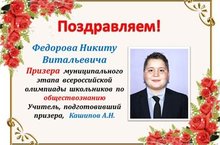Федоров Никита, ученик 6 класса, стал призером муниципального этапа всероссийской олимпиады школьников по обществознанию (учитель Кашипов А.Н.) Поздравляем!