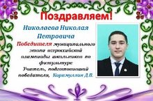 Николаев Николай, ученик 9 класса, стал победителем муниципального этапа всероссийской олимпиады школьников по физкультуре (учитель Каримуллин Д.В.) Поздравляем! Молодец. Желаем дальнейших успехов!