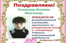 Усманова Ксения, ученица 9 класса, стала победителем республиканской олимпиады школьников по удмуртскому языку и литературе (учитель Андреева Л.М.) Поздравляем! Молодец. Желаем дальнейших успехов!