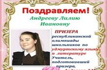 Андреева Лилия, ученица 11 класса, стала призером республиканской олимпиады школьников по удмуртскому языку и литературе (учитель Андреева Л.М.) Поздравляем! Молодец. Желаем дальнейших успехов!