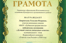 В рамках Всероссийского конкурса "Учитель года России" в 2020 году учитель начальных классов Лаврентьева Гюзелия Флеровна стала победителем в номинации "Лучший учитель начальных классов" и награждено грамотой Управления образования Исполнительного комитета Кукморского муниципального района Республики Татарстан