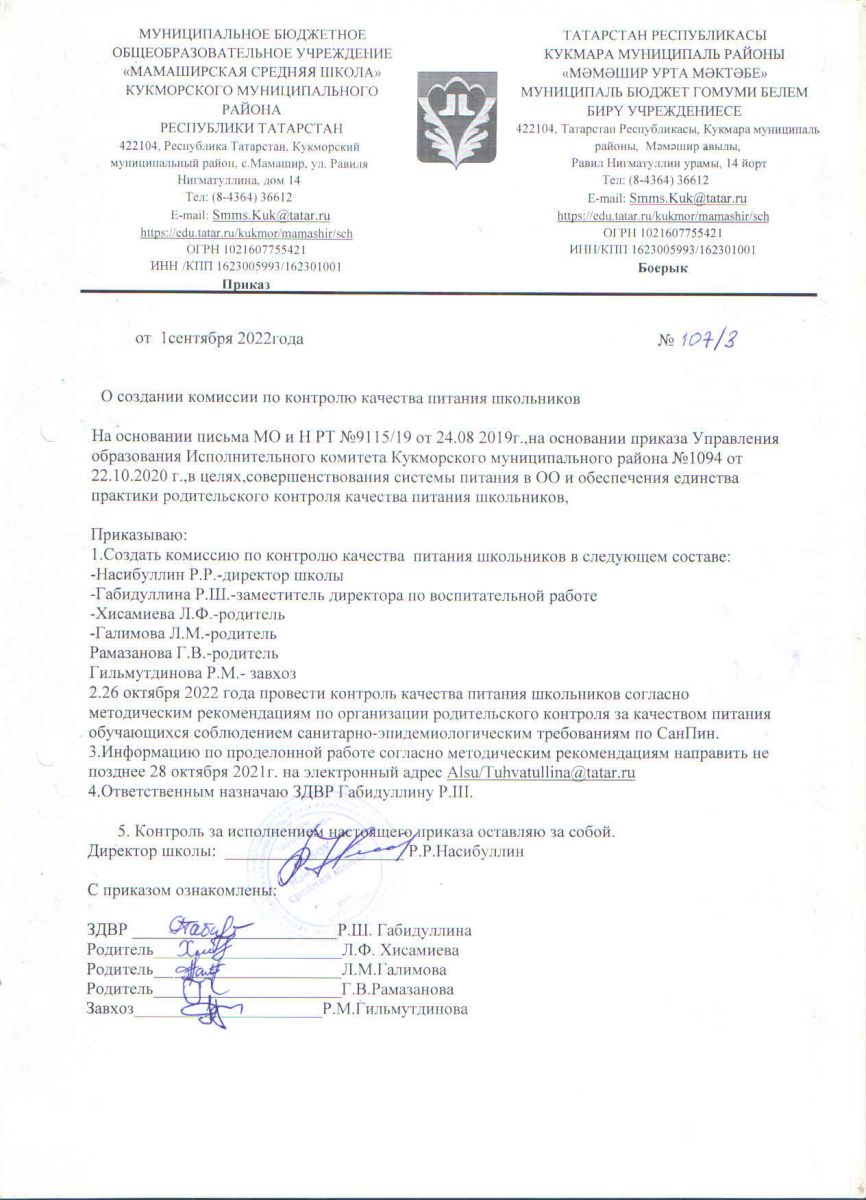 Приказ о создании комиссии по контролю питания