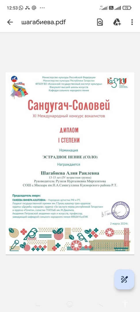 В Казанском государственном институте культуры прошел международный конкурс вокалистов “Сандугач - соловей”. В этом конкурсе ученица 9 класса Шагабеева Алия награждена Дипломом I степени! Поздравляем Алию с успешным выступлением!!! Желаем покорения еще больших высот!