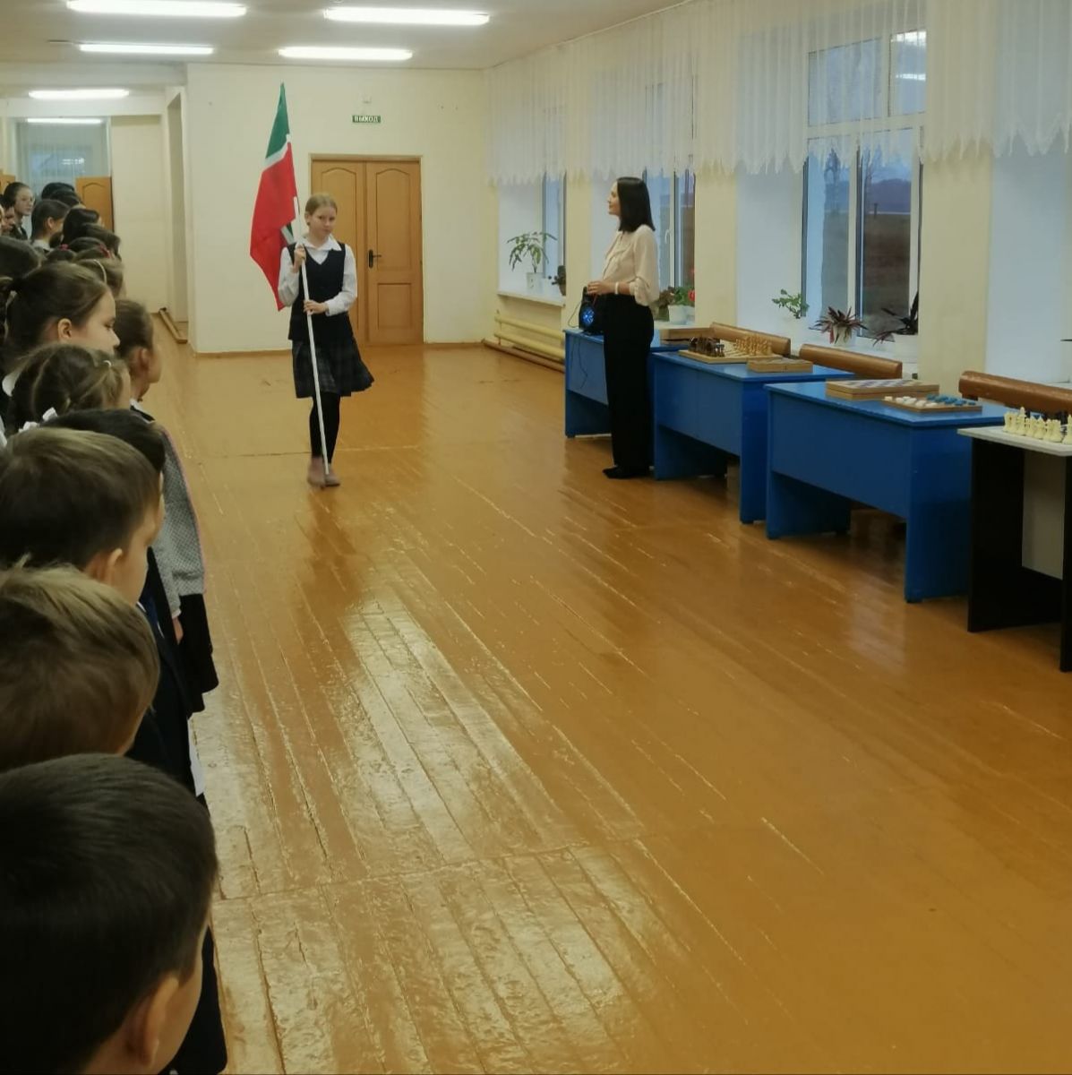 Каждая неделя начинается с поднятия государственных флагов и исполнения государственных гимнов.