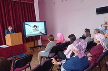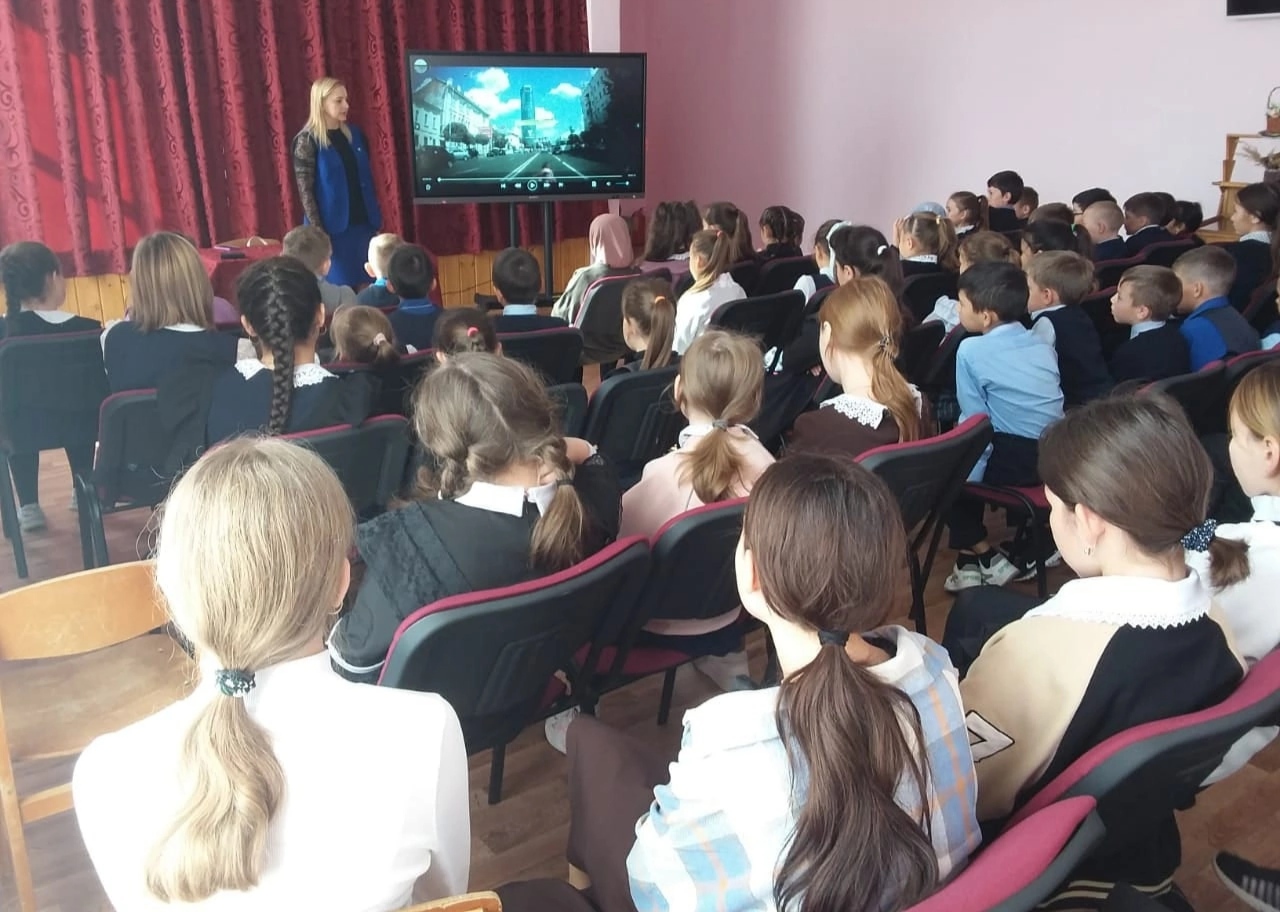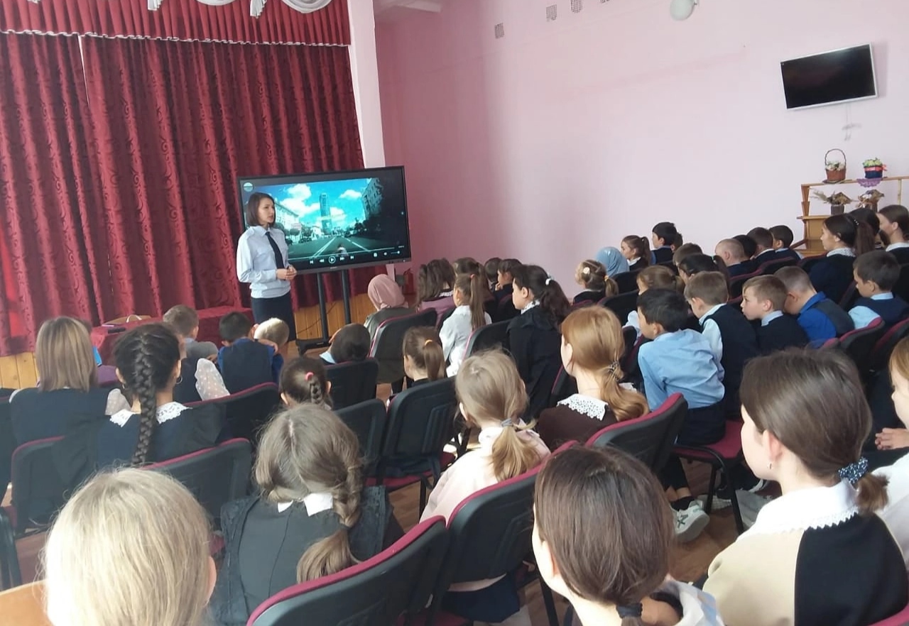"Юл йөрү куркынычсызлыгы" иминлеген, юл-транспорт хәлакәтләрен булдырмауны, өс киемнәрендә яктылык кайтаргыч элементларны популярлаштыру максатыннан Яковлева Елена Владимировна (Начальник отделения в Кукморском районе отдела профилактики ТУ в г.Казань ГБУ "БДД") һәм Айгөл Ильдаровна (ведущий специалист по профилактике семейного неблагополучия и правонарушений среди н/с) укучылар белән әңгәмә оештырдылар.
