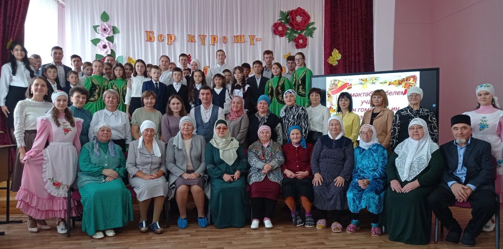 "Бер күрешү - үзе бер гомер!" исеме астында зирәклек һәм изгелек бәйрәме узды. Укытучы һәм остаз елы уңаеннан, Өлкәннәр көне һәм Укытучылар көне кысаларында узган әлеге бәйрәмгә, озак еллар мәктәбебездә хезмәт куйган остаз укытучыларыбыз һәм техник хезмәткәрләр чакырылган иде. Җыр-бию, матур хатирәләр, кызыклы вакыйгалар, изге теләкләр яңгырады бүген мәктәбебез залында.