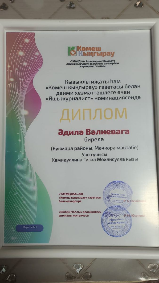 В Набережночелнинской гимназии № 2 имени Мулланура Вахитова прошел насыщенный вечер. Праздник был организован с целью подведения итогов 2022 года, выявления и чествования активных корреспондентов газеты, а самым достойным - вручения литературно-общественных премий имени Шауката Галиева. Не случайно литературная премия названа именем Шауката Галиева. Он - один из самых выдающихся литераторов, внесших значительный вклад в детскую литературу. В этом году общественность отметит 95-летие Шауката Галиева. Премия Шауката Галиева в этом году в 4-й раз присуждается четырем юным корреспондентам и одному старшему автору за интересные литературно-журналистские публикации и постоянное сотрудничество с газетой «Серебряный звонок». Наиболее активных молодых журналистов, сотрудничающих с газетой, поздравила первый редактор газеты «Көмеш кенгырау» Насима Садыкова.Среди этих юных корреспондентов была ученица 5 класса нашей школы Валеева Аделя. Поздравляем Аделю с успехом! В дальнейшем желаем продолжать заниматься любимым делом, добиваться больших успехов!