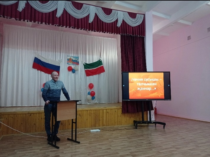 Патриотик тәрбия айлыгының чираттагы күркәм бәйрәме - "Чечня сугышы - талчыккан җаннар" дип аталды. Мәктәбебезгә чечня сугышы ветераннары Мәчкәрә авылында туып-үскән Шакиров Хәниф абый һәм Күкшел авылыннан Шакиров Расих абый килде. Алар икесе дә мәктәбебездә белем алганнар, бүгенге көндә үз һөнәрләрен табып, тормышның ямен-тәмен татып яшәүче мәктәбебез һәм җирлегебезнең горурлыклары! Бәйрәмебезнең икенче өлешендә өлкән сыйныф егетләре катнашында "А, ну-ка, парни!" спорт ярышлары үткәрелде, ә кунакларыбыз жюри ролен үтәде.