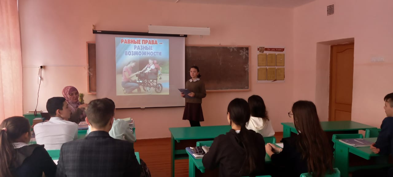 В 4 классе руководитель Шарипова Д. И. провела воспитательный час в рамках Декады инвалидов. Они слушали песню известной российской певицы Дианы Гурцкой. Ознакомились с ее жизнедеятельностью и творчеством. Играли в разные игры. Была проведена беседа о "Мечтах". Они пришел к выводу, что независимо от того, инвалид он или здоровый человек, каждый может получить образование, заниматься любимым делом.