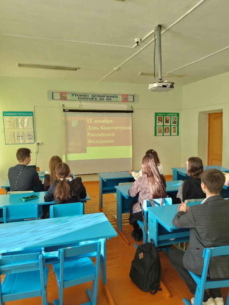 Тарих һәм җәмгыять белеме атналыгы кысаларында безнең мәктәптә РФ Конституциясе көненә багышланган дәресләр үткәрелде. Укучылар дәүләтнең төп законы эчтәлеген искә төшерделәр, хакимият тармаклары турындагы сорауларга җавап бирделәр, Россия гражданнарының хокуклары һәм бурычлары турында сөйләштеләр.