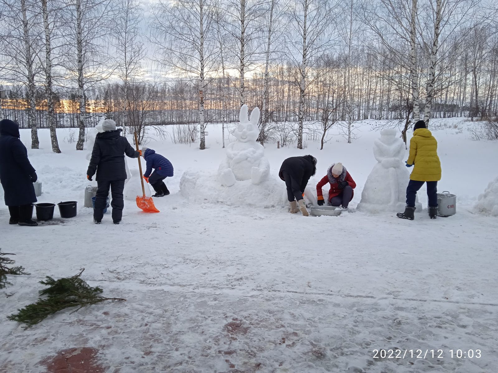Мәктәбебез территориясенә яңа ел символы Йомшак Куян сыннары, яшел чыршылар һәм җәнлекләр белән бизәлде. Иң түрдә - 2023нче ел, Россиядә Укытучы һәм остаз елы символы булырлык, ачык китап белән каләм тора.