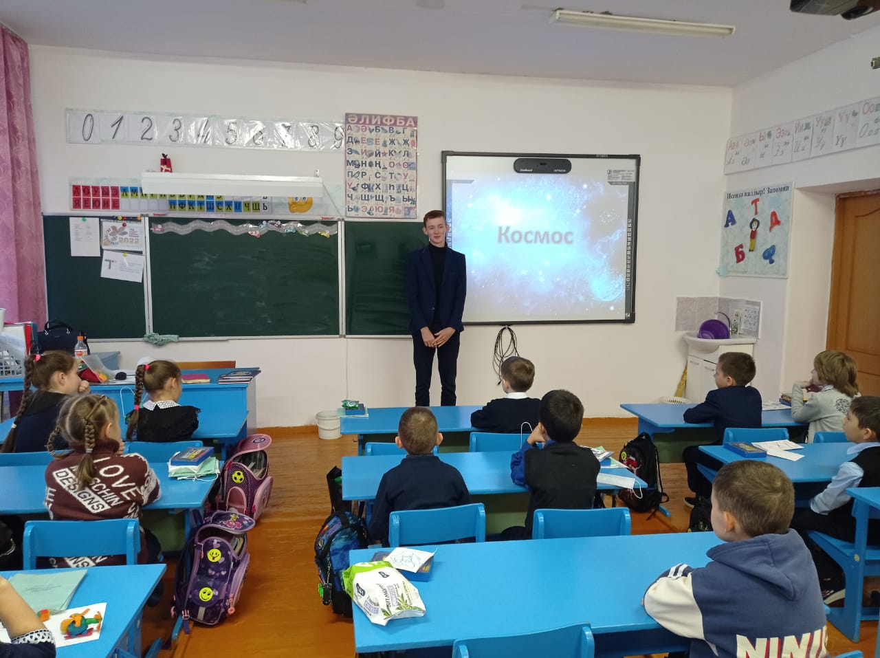 В рамках саморазвития и личностного роста учащихся страших классов, ученик 8 класса Валиуллин Раяз провел "Увлекательный час" с учащимися 1-2 классов на тему "Космос".