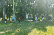 Двенадцатый день пришкольного лагеря. Солнечное утро началось с торжественной линейки, посвящённой Дню России. После утренней зарядки и вкусного завтрака беседовали об истории праздника и о символах России. После этого ребята играли на свежем воздухе.